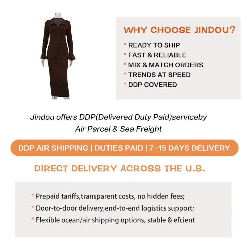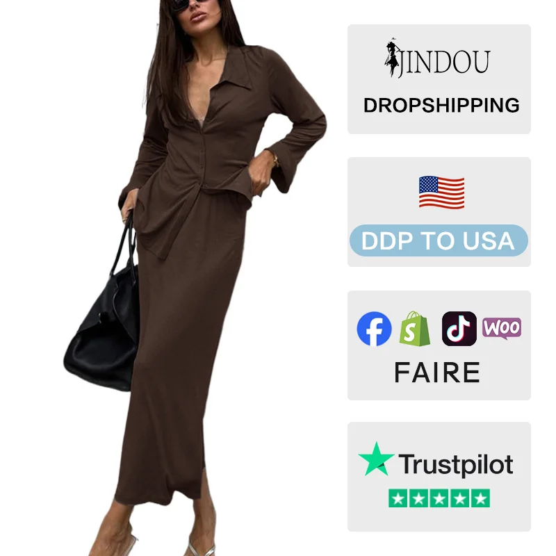 Brown Autumn Solid Woven Long Sleeve Casual 2-Piece Modal Blouse and Midi Skirt Set for Women
